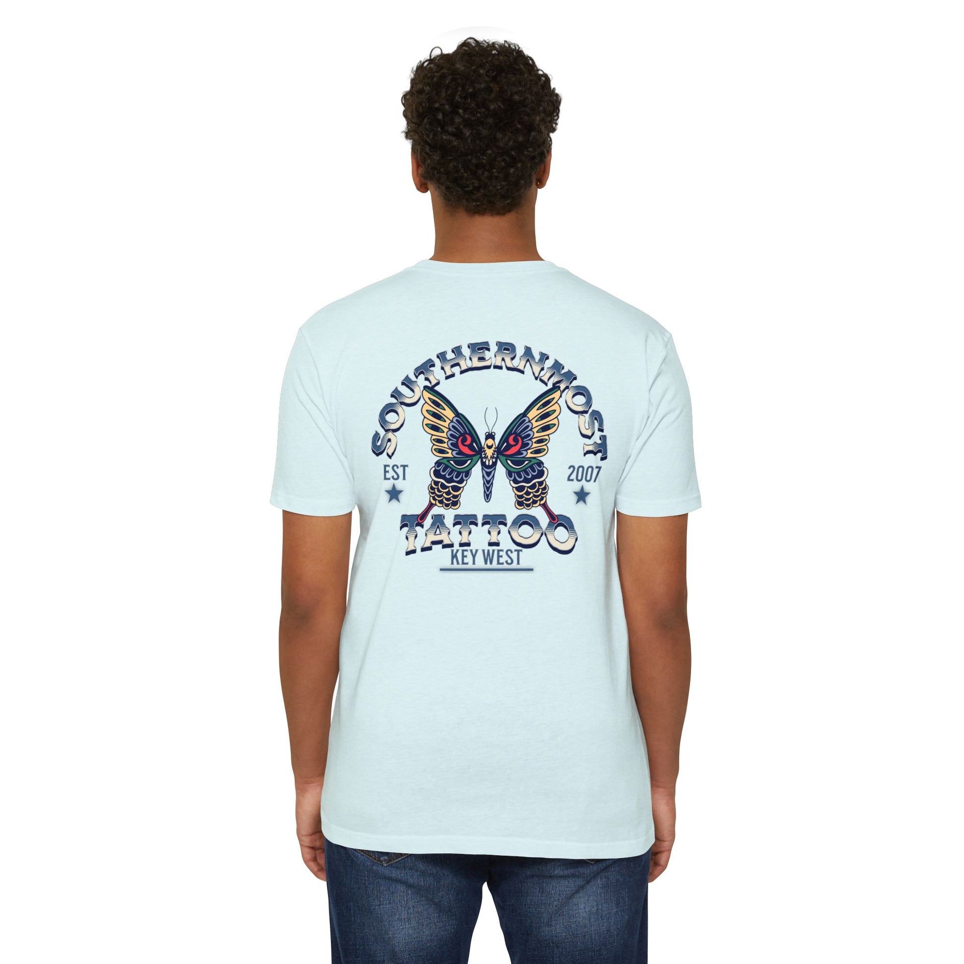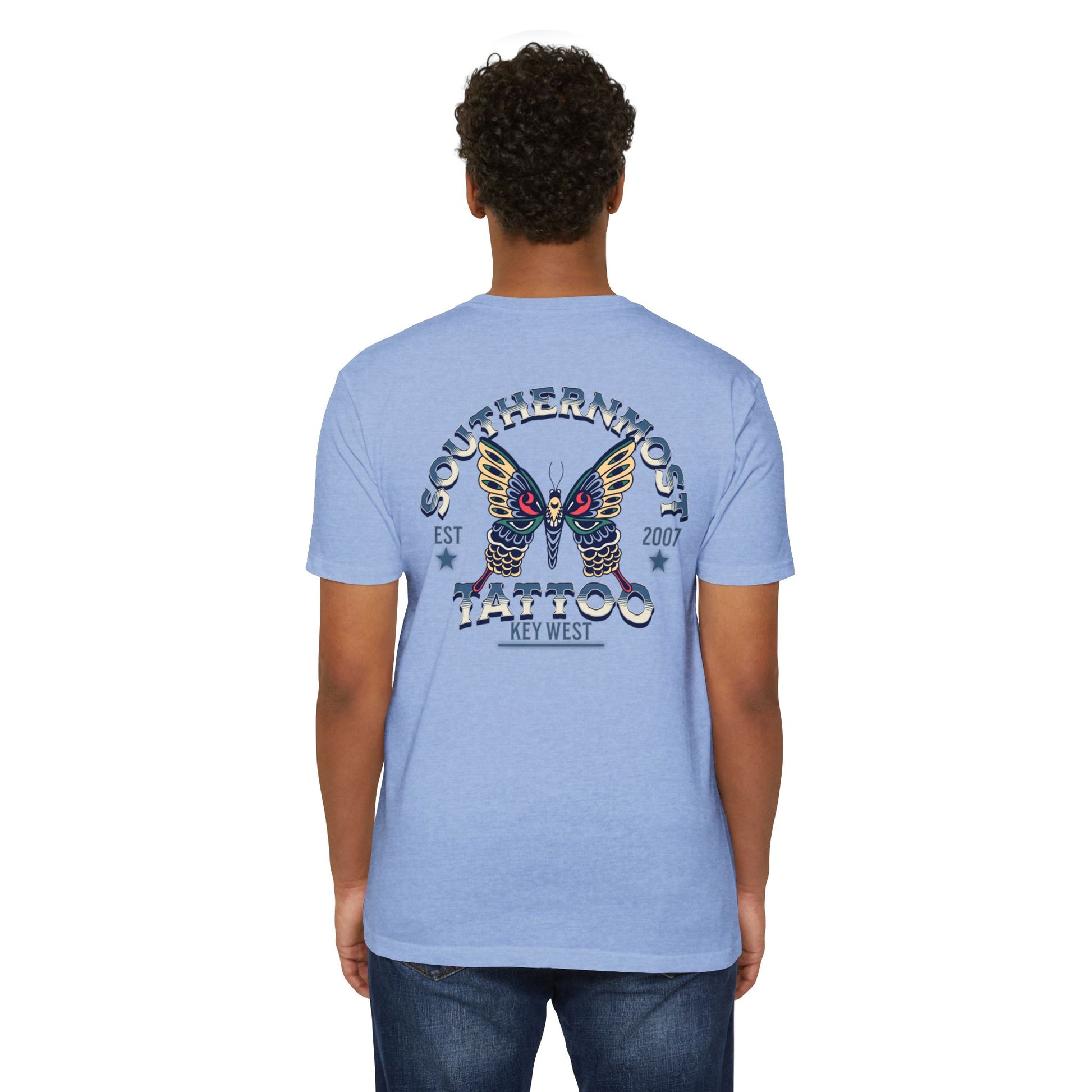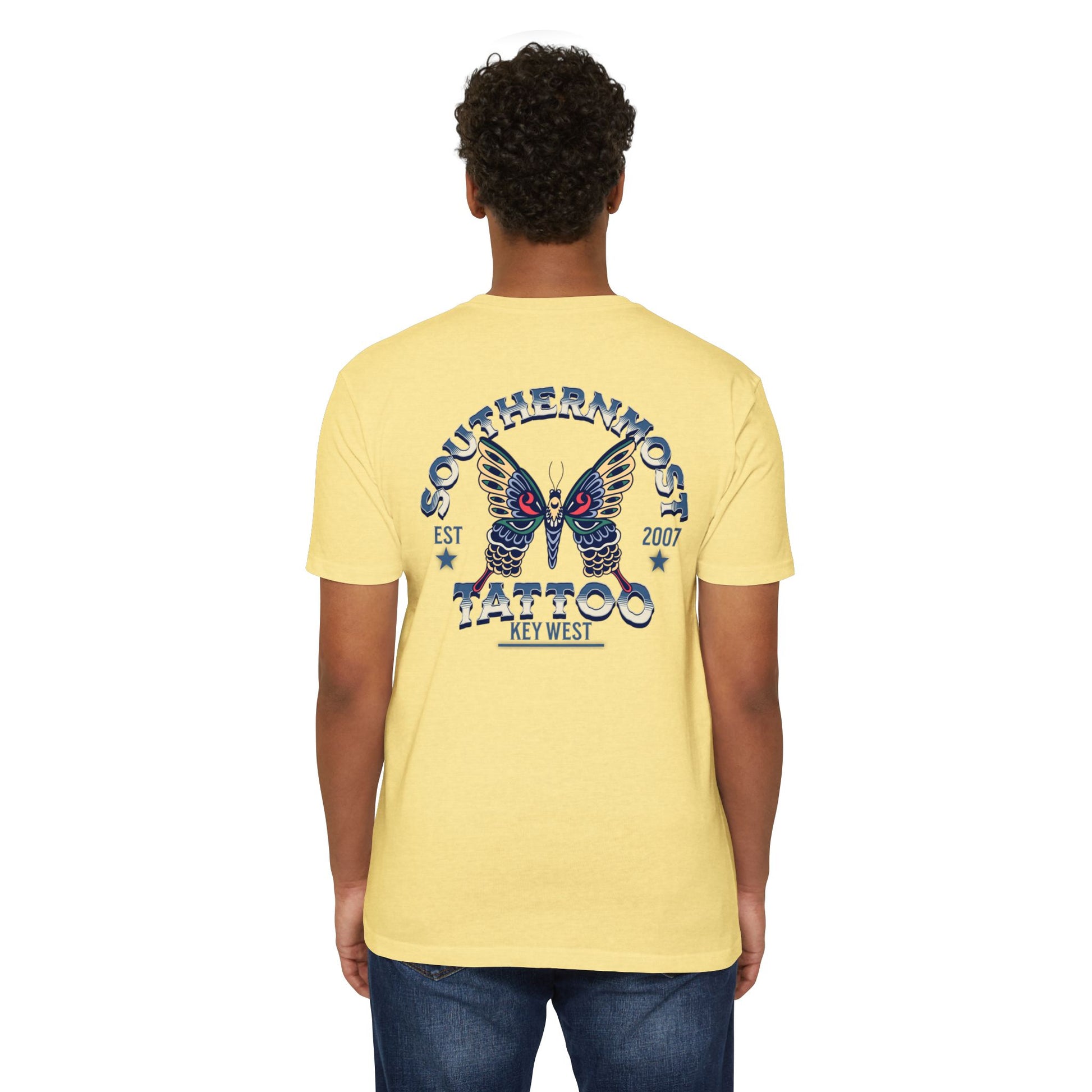 Introducing the Southernmost Tattoo Butterfly design T-shirt - where style meets comfort! Our unisex CVC jersey tee offers the perfect blend of quality and comfort. Crafted from a 60% combed, ring-spun cotton and 40% polyester blend, it's not only incredibly soft but also highly durable.